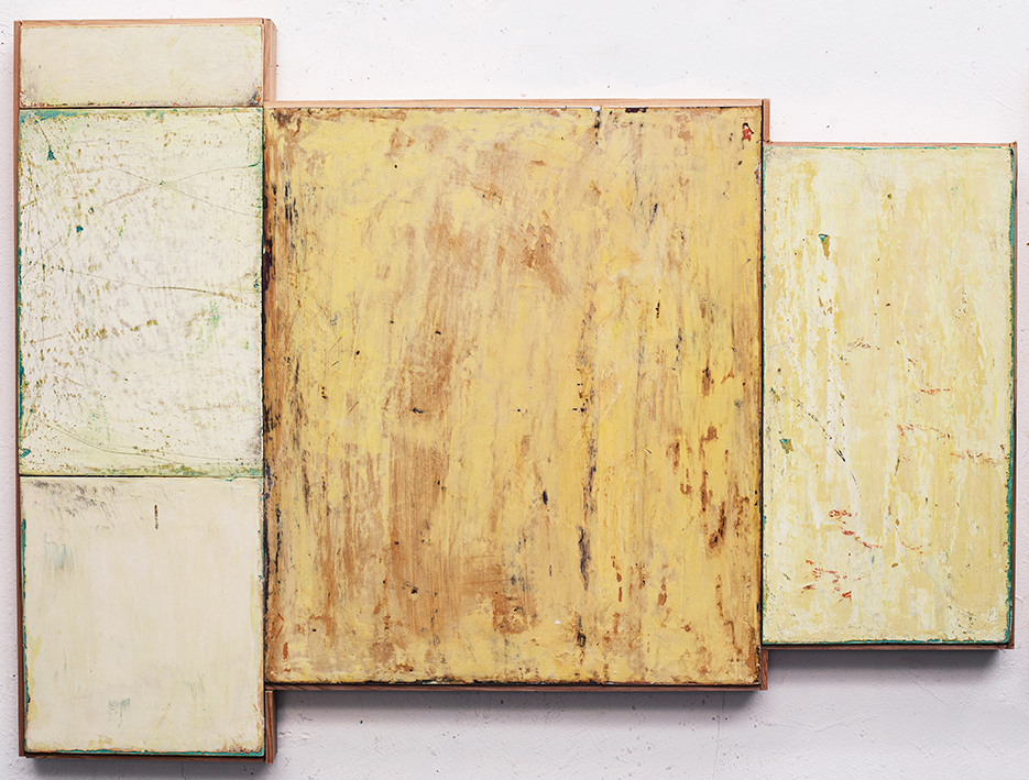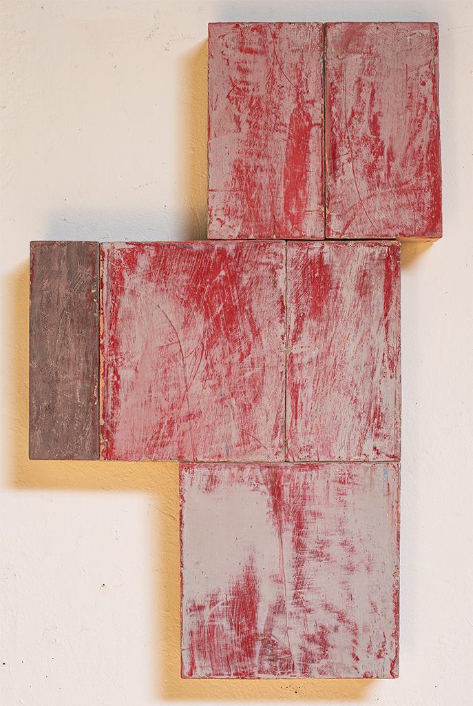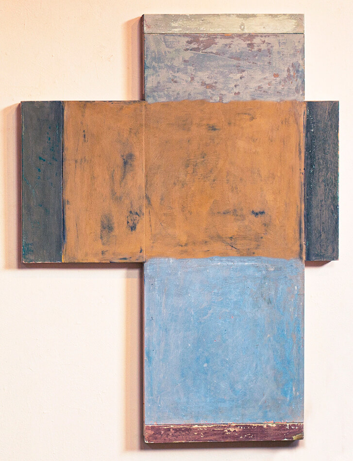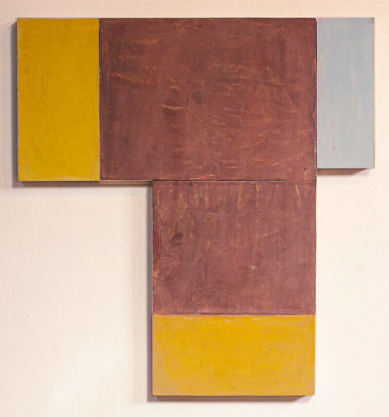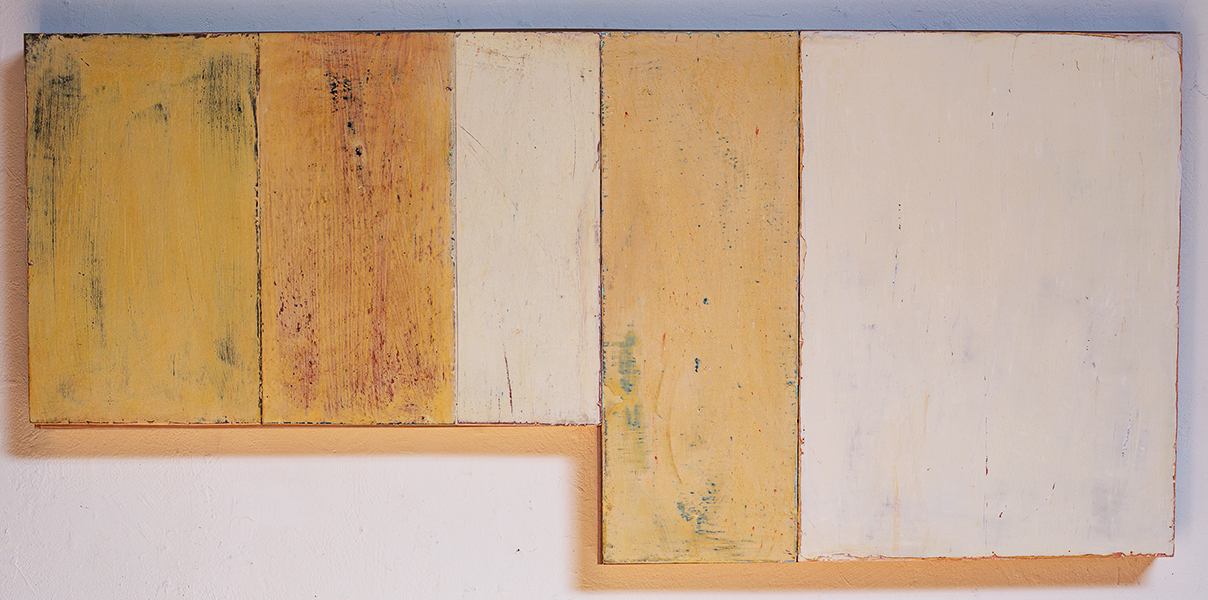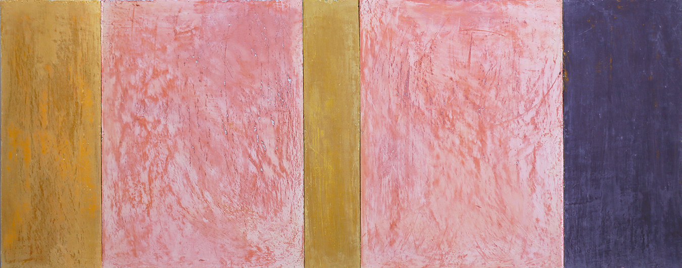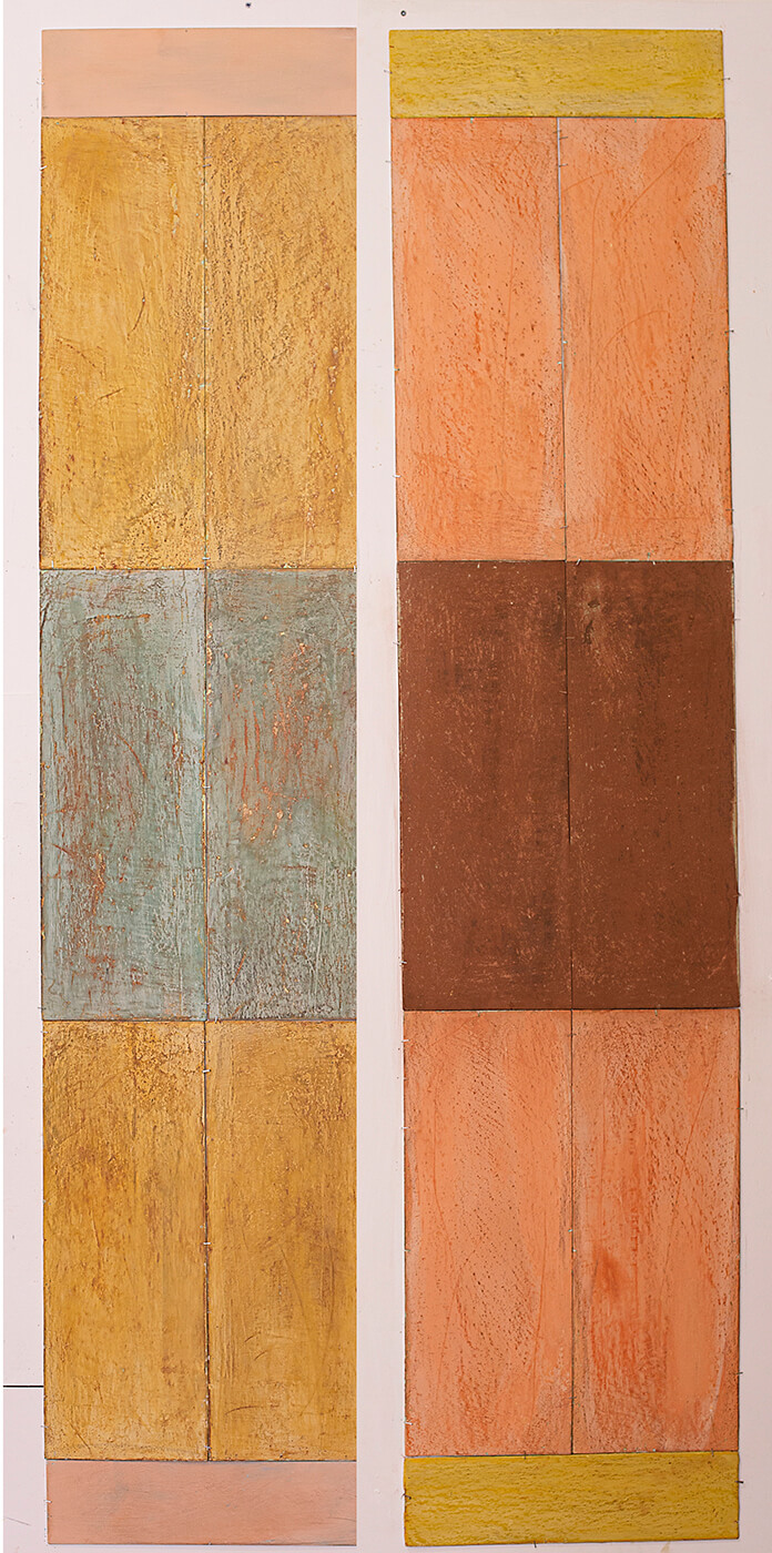 In applying the plaster to the wood, Fels works with two ancient Italian painting traditions. The fresco technique, historically applied to plaster wall surfaces, is cojoined in these pieces with traditional poplar panel painting. Thanks to its stability, poplar has been employed for Italian panel paintings for many centuries. Fashioning the pieces from sections of wood, the work refers to the modular form of altarpieces, albeit without iconography. Viewing the act of painting as meditation, Fels has spent years looking at altarpieces in Europe and Asia.
