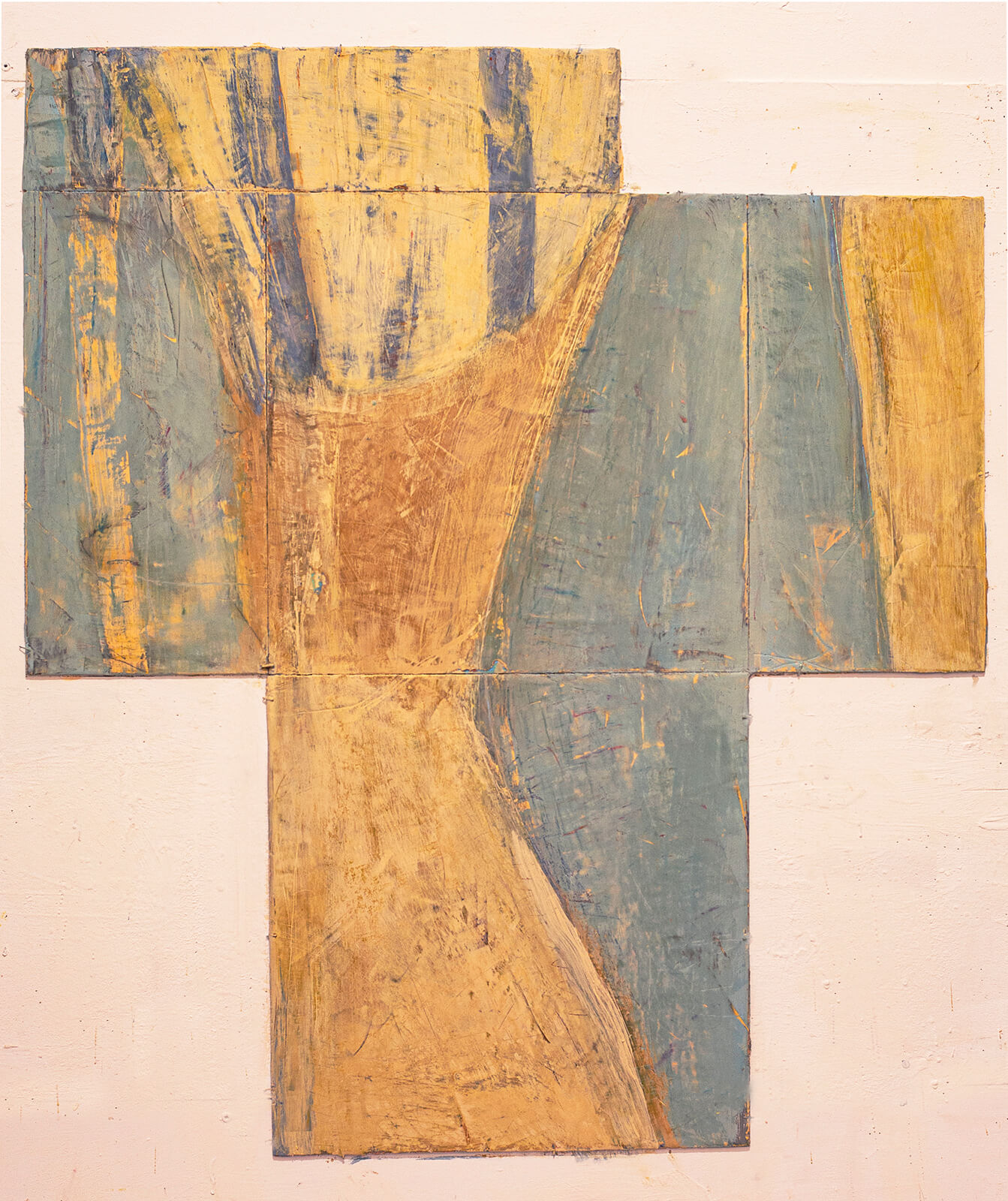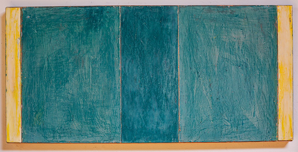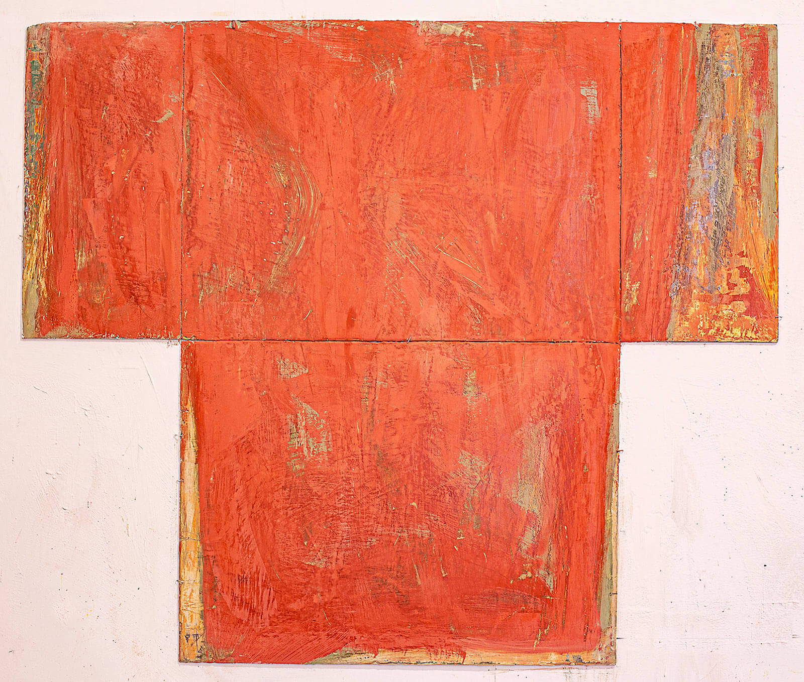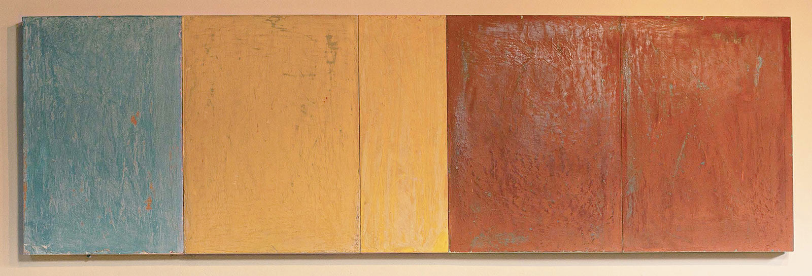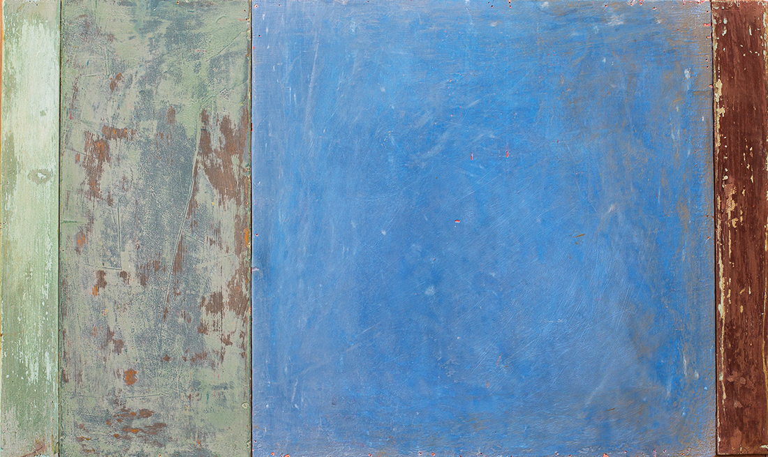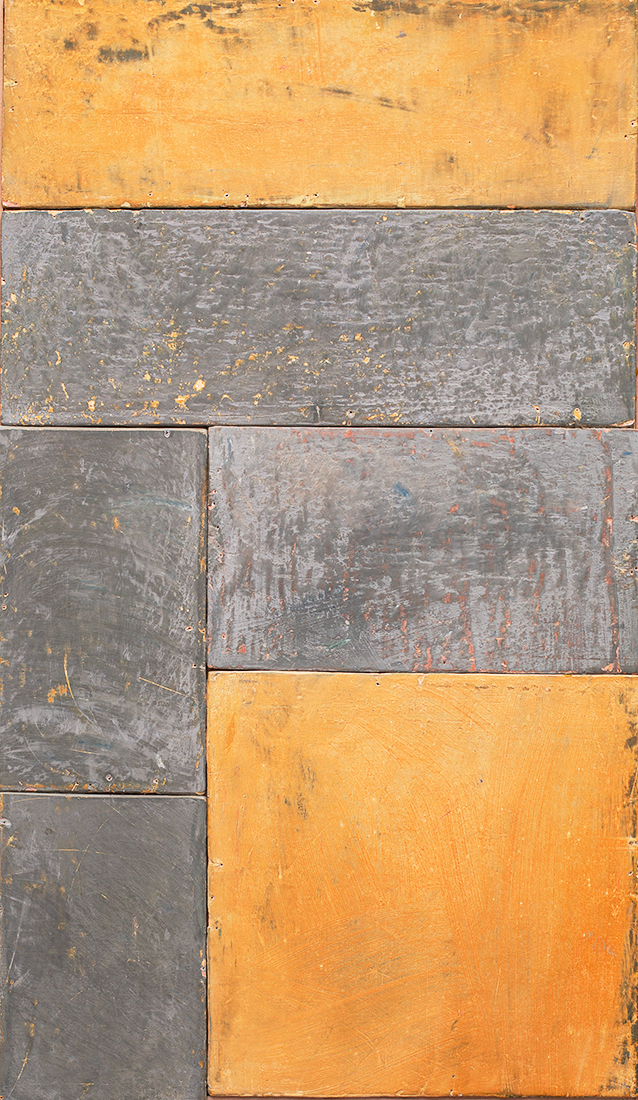 In applying the plaster to the wood, Fels works with two ancient Italian painting traditions. The fresco technique, historically applied to plaster wall surfaces, is cojoined in these pieces with traditional poplar panel painting. Thanks to its stability, poplar has been employed for Italian panel paintings for many centuries. Fashioning the pieces from sections of wood, the work refers to the modular form of altarpieces, albeit without iconography. Viewing the act of painting as meditation, Fels has spent years looking at altarpieces in Europe and Asia.