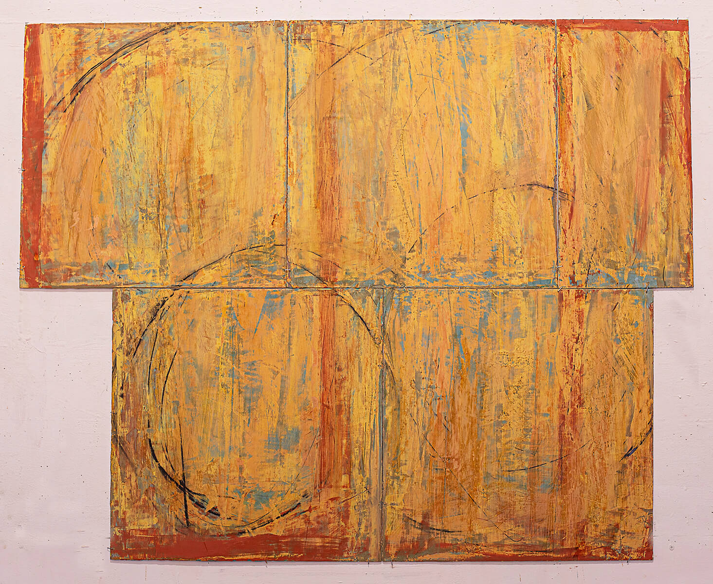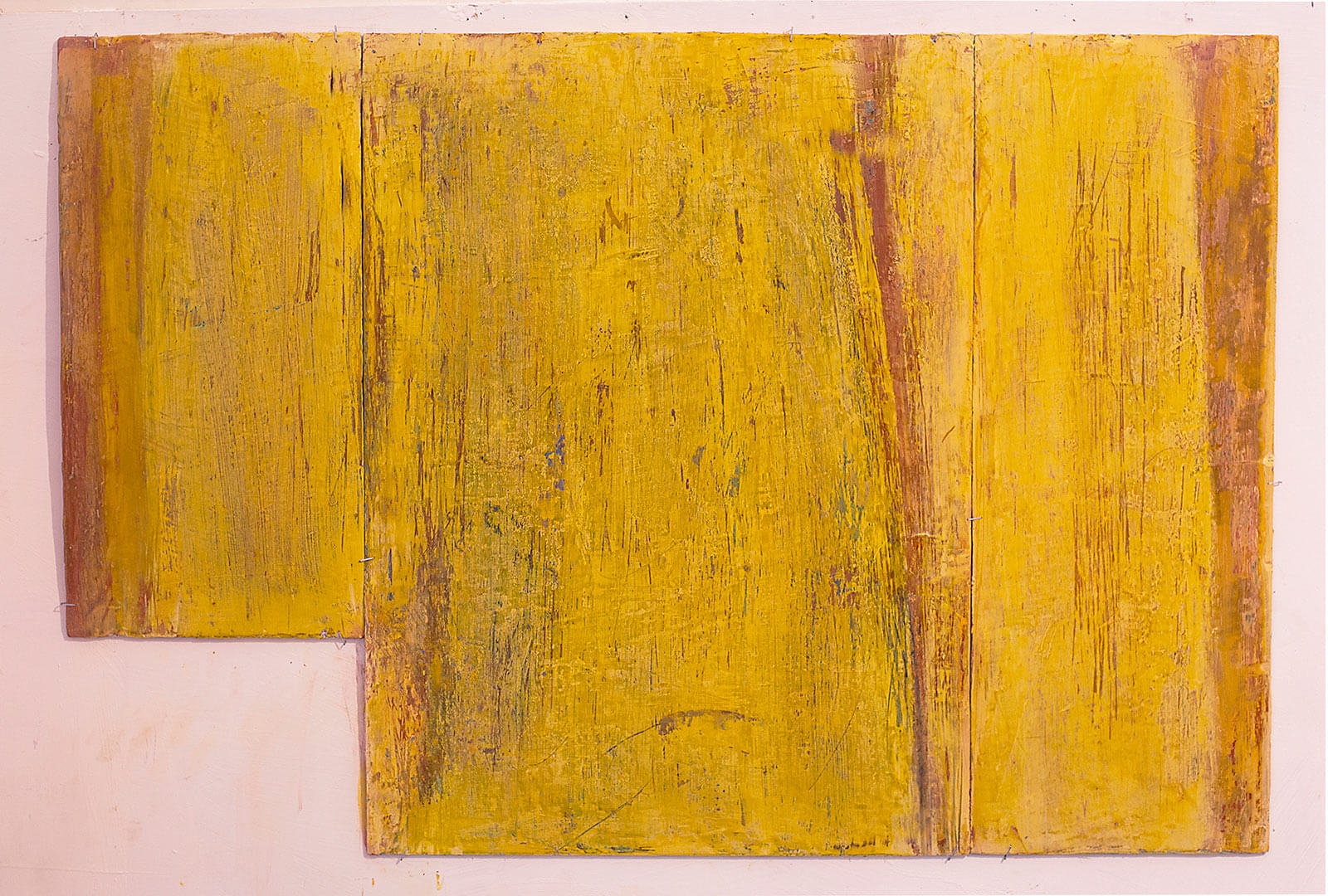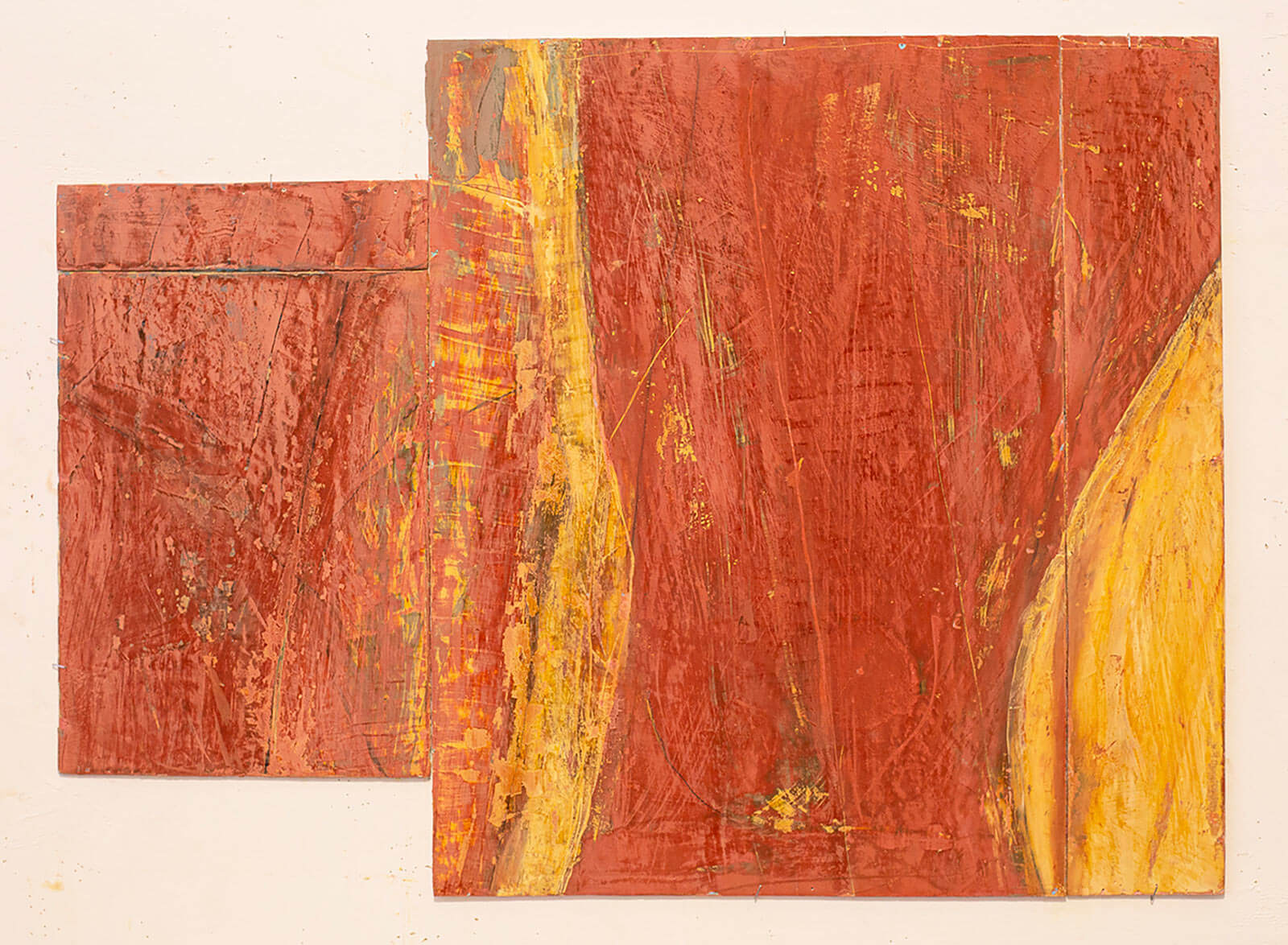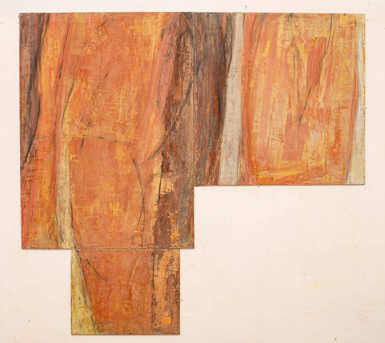 In applying the plaster to the wood, Fels works with two ancient Italian painting traditions. The fresco technique, historically applied to plaster wall surfaces, is cojoined in these pieces with traditional poplar panel painting. Thanks to its stability, poplar has been employed for Italian panel paintings for many centuries. Fashioning the pieces from sections of wood, the work refers to the modular form of altarpieces, albeit without iconography. Viewing the act of painting as meditation, Fels has spent years looking at altarpieces in Europe and Asia.