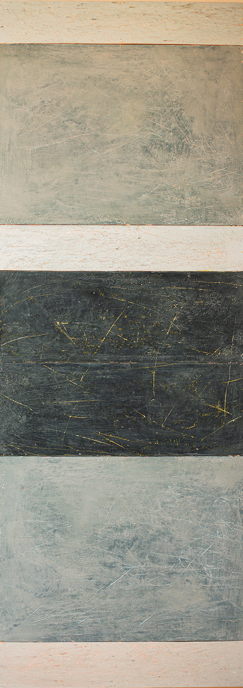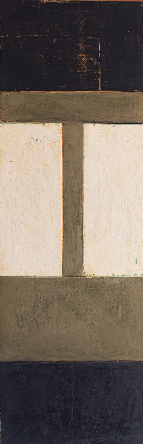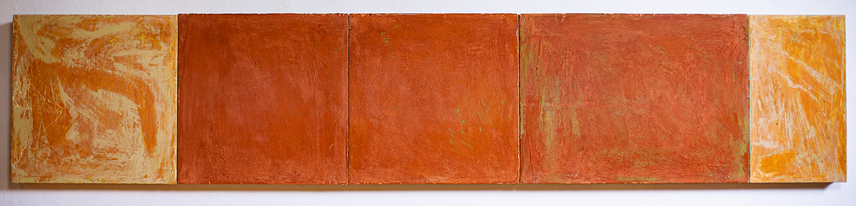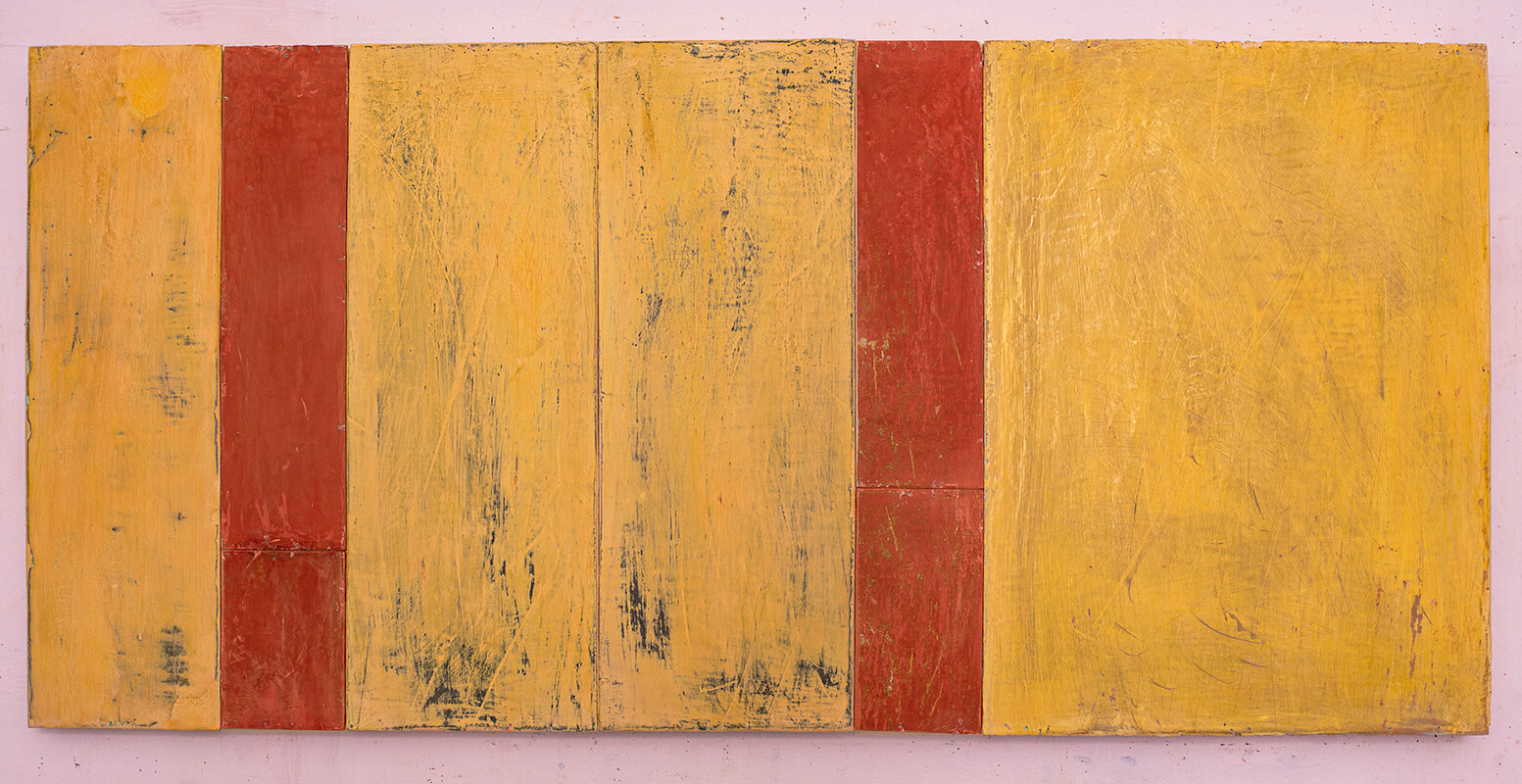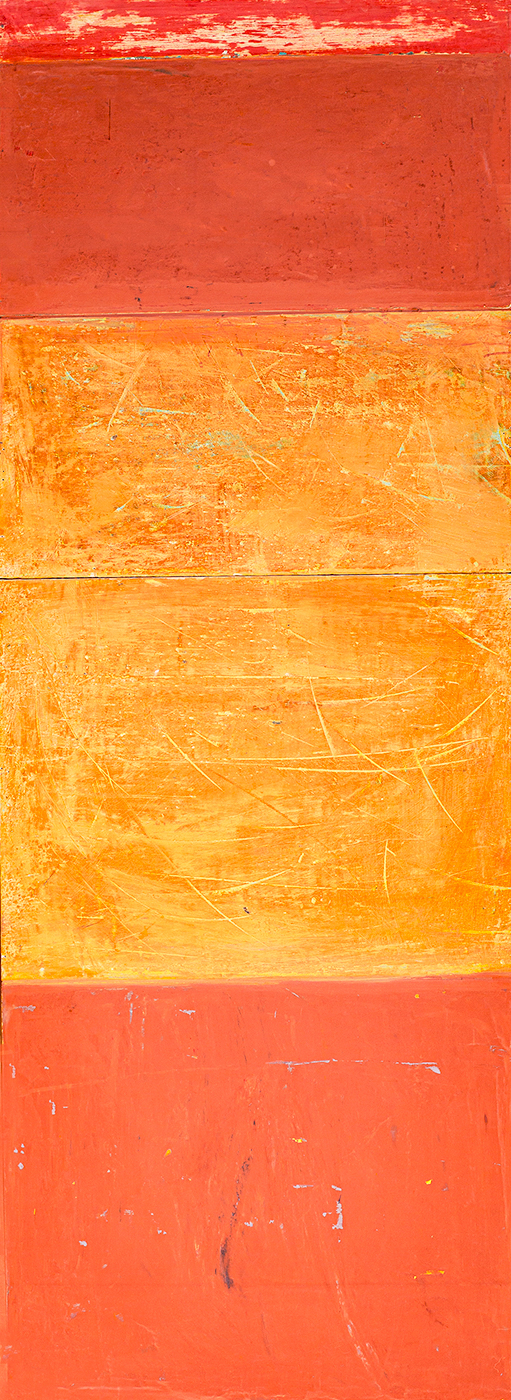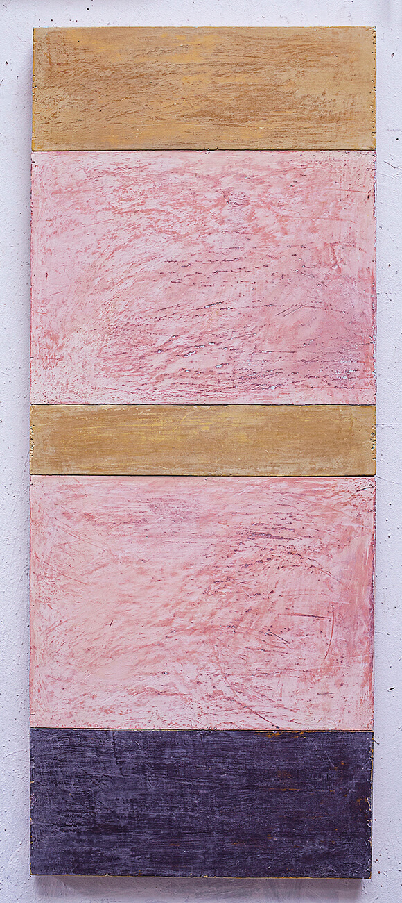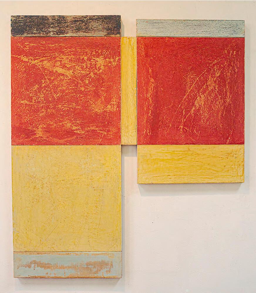 In applying the plaster to the wood, Fels works with two ancient Italian painting traditions. The fresco technique, historically applied to plaster wall surfaces, is cojoined in these pieces with traditional poplar panel painting. Thanks to its stability, poplar has been employed for Italian panel paintings for many centuries. Fashioning the pieces from sections of wood, the work refers to the modular form of altarpieces, albeit without iconography. Viewing the act of painting as meditation, Fels has spent years looking at altarpieces in Europe and Asia.