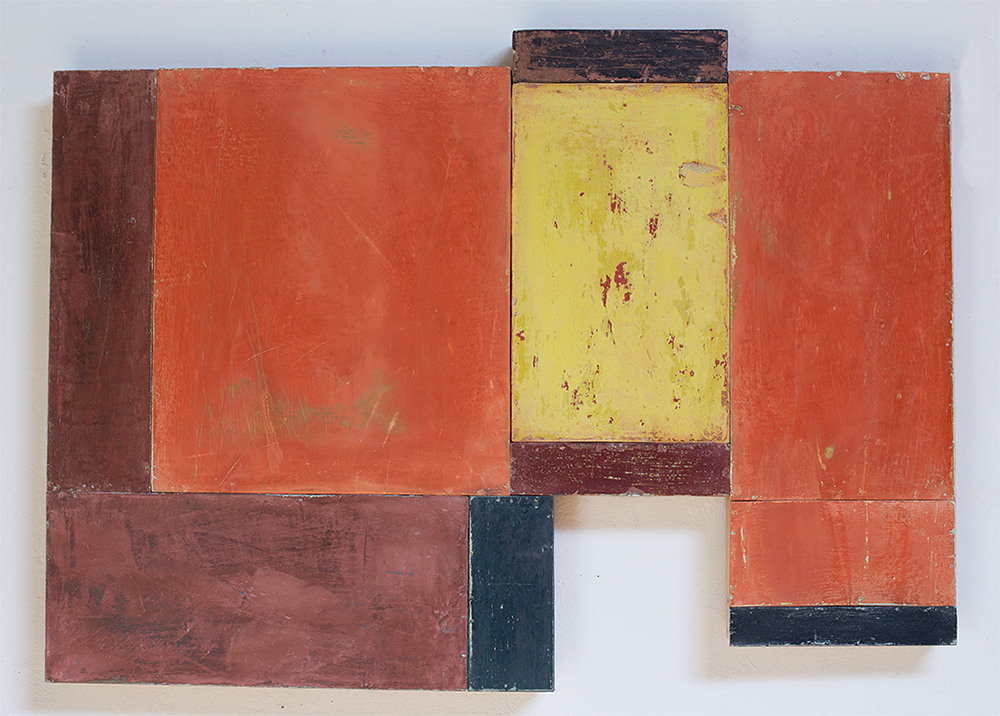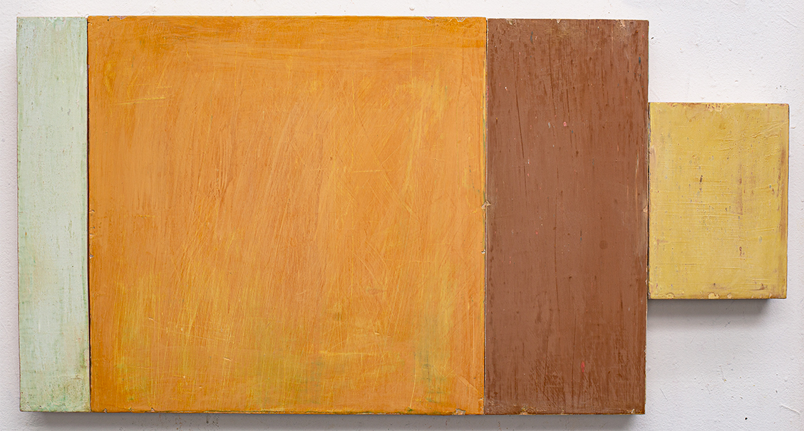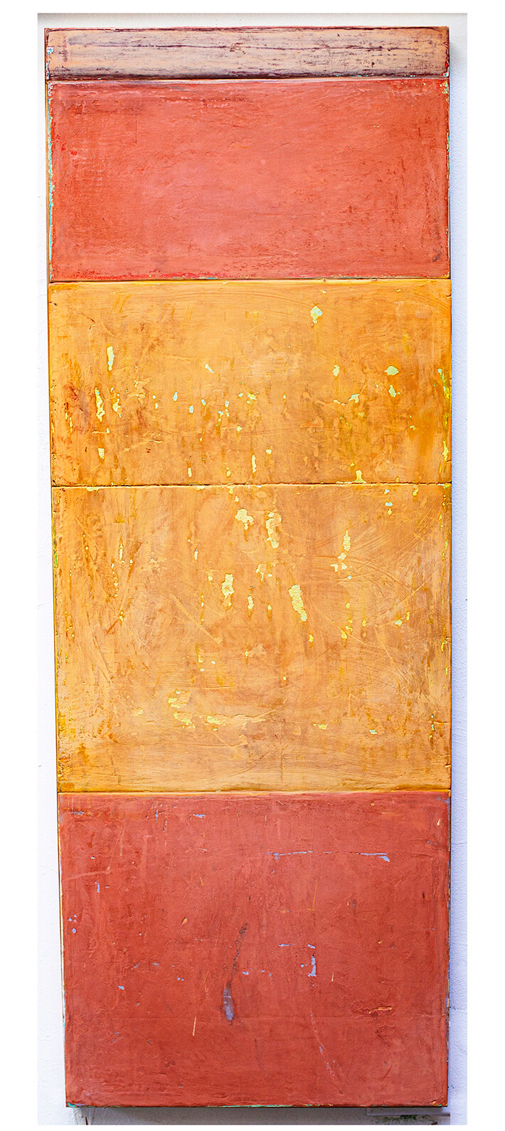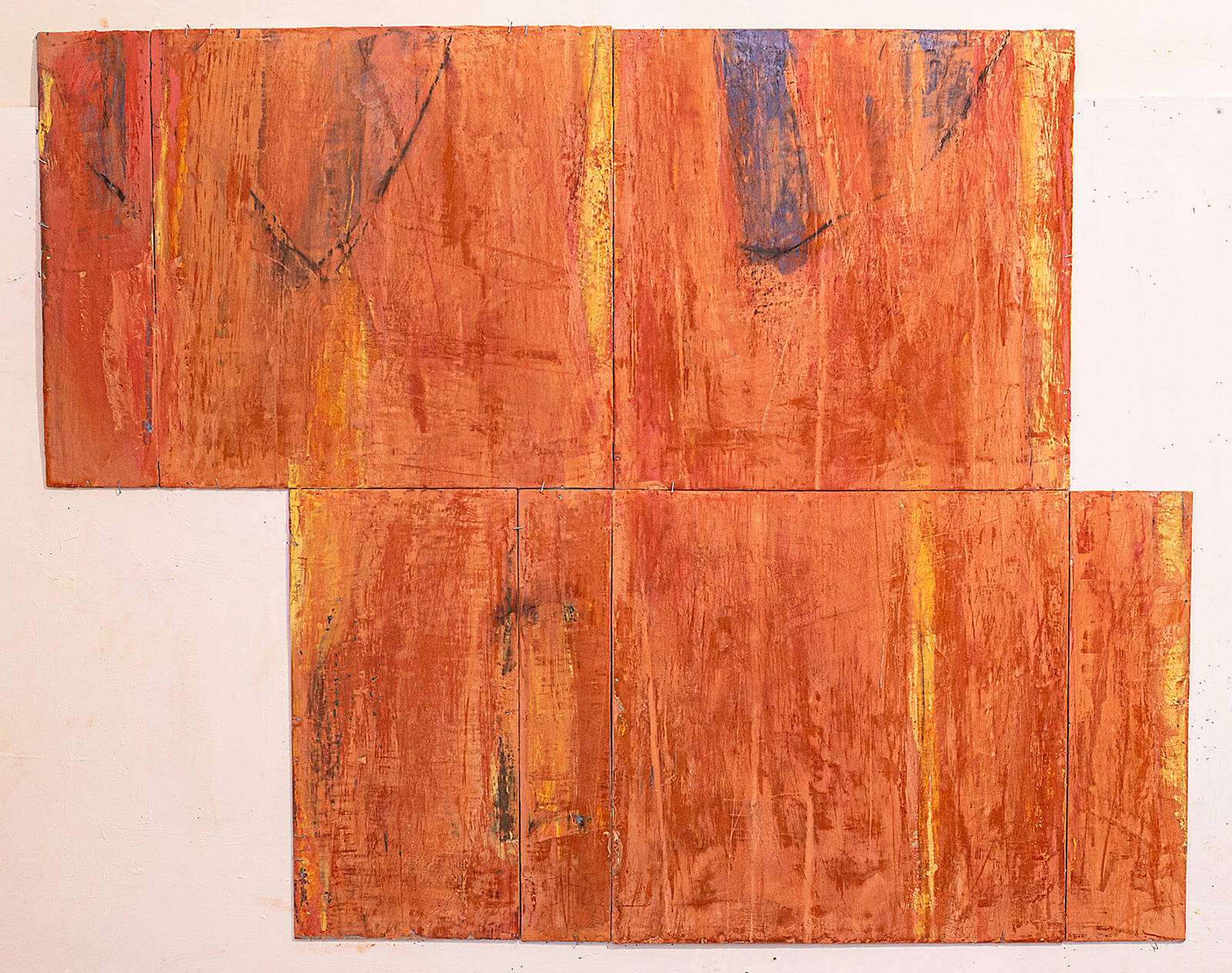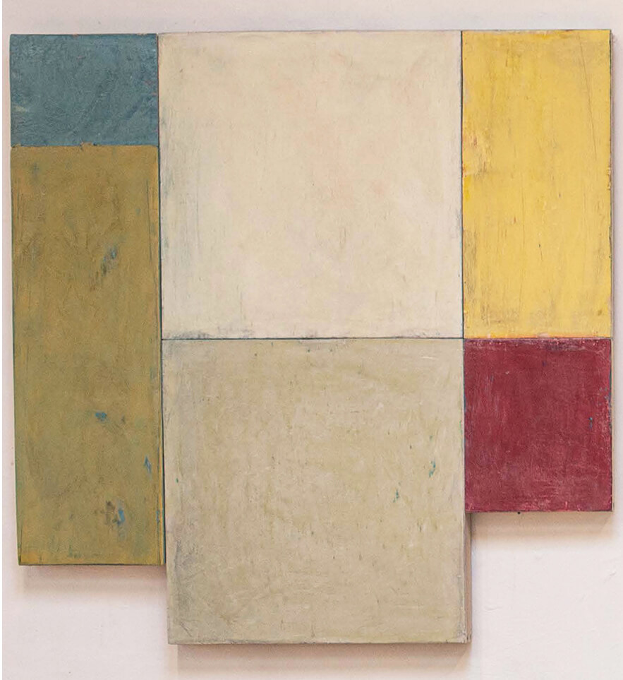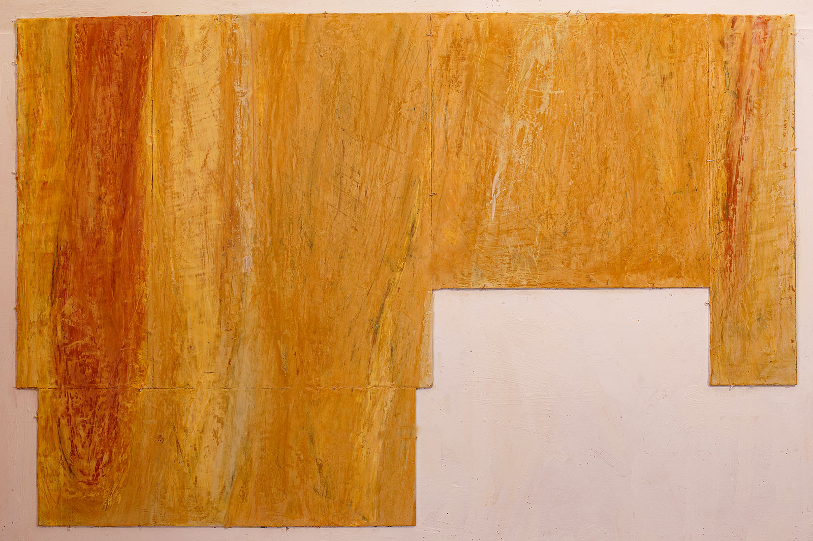 In applying the plaster to the wood, Fels works with two ancient Italian painting traditions. The fresco technique, historically applied to plaster wall surfaces, is cojoined in these pieces with traditional poplar panel painting. Thanks to its stability, poplar has been employed for Italian panel paintings for many centuries. Fashioning the pieces from sections of wood, the work refers to the modular form of altarpieces, albeit without iconography. Viewing the act of painting as meditation, Fels has spent years looking at altarpieces in Europe and Asia.