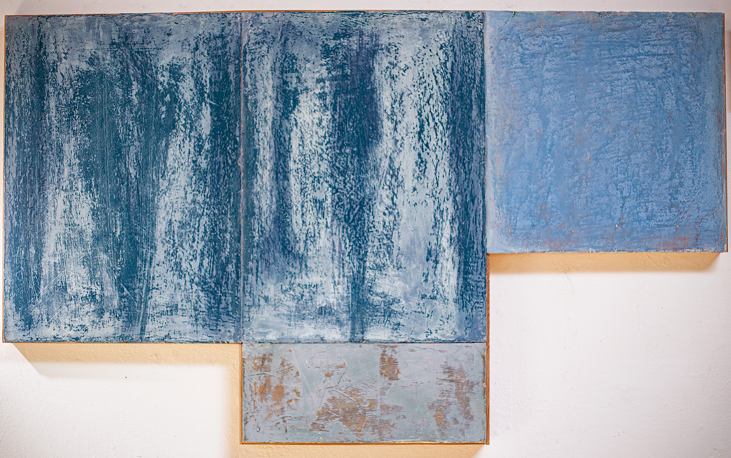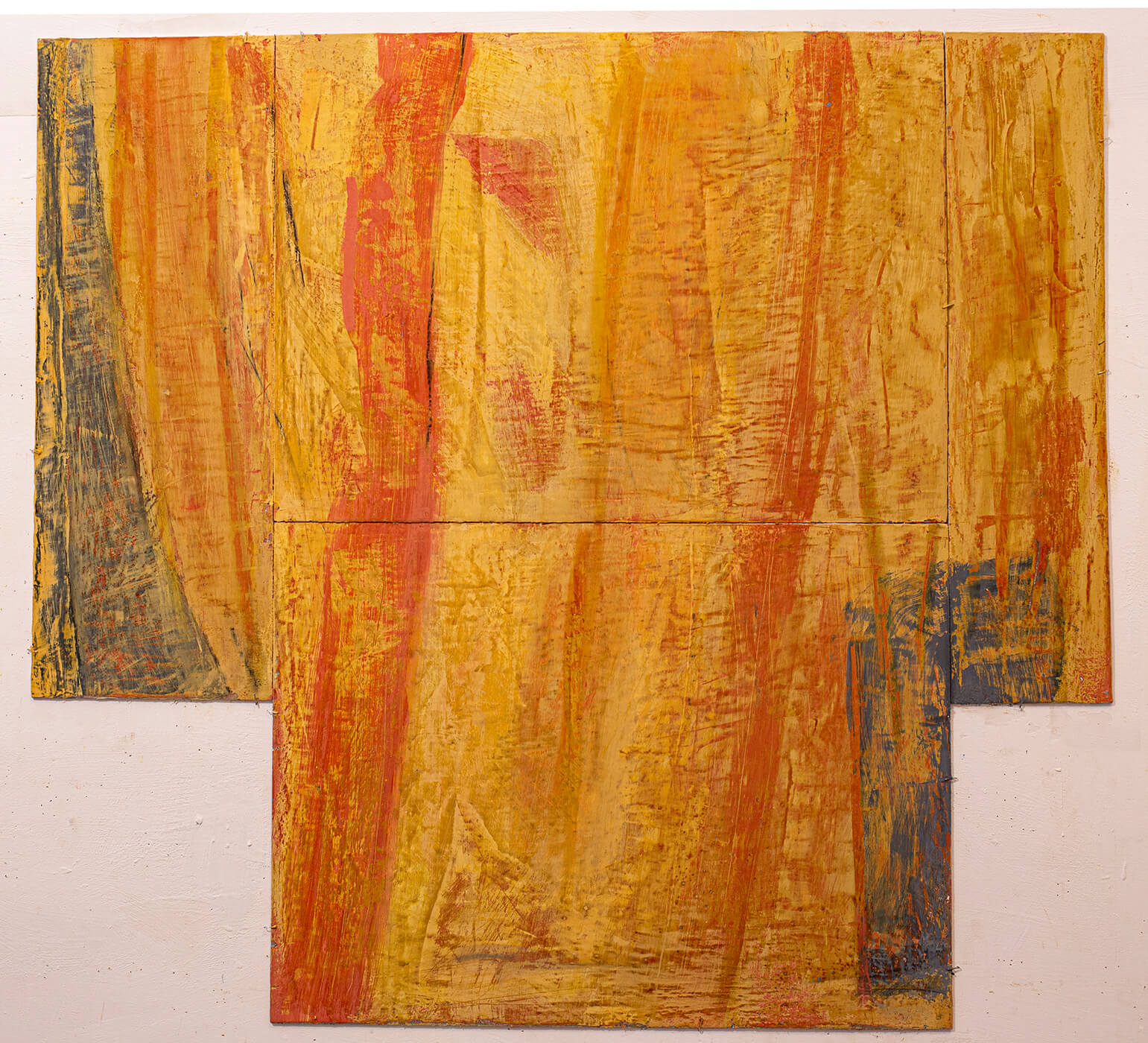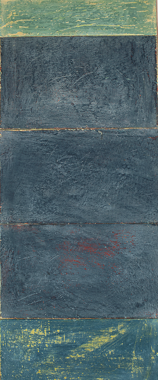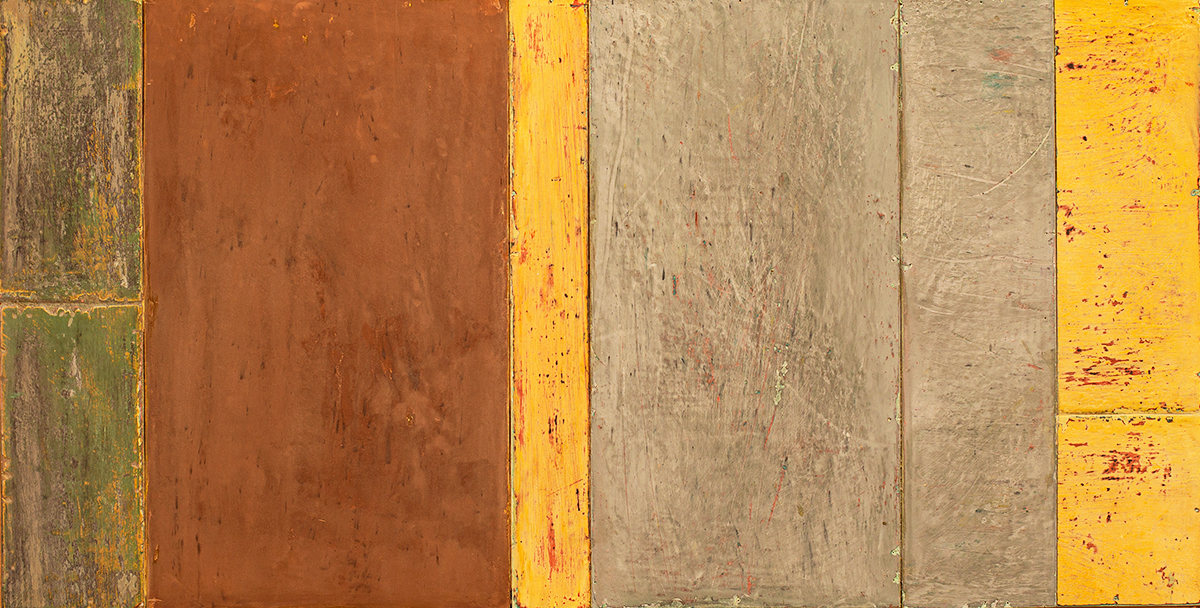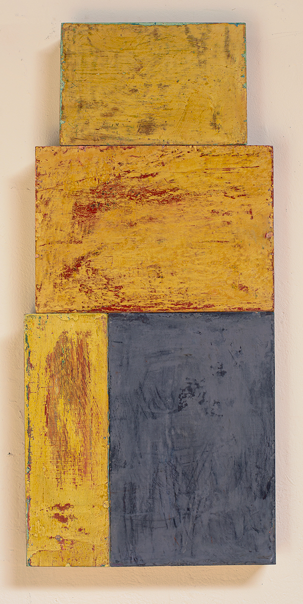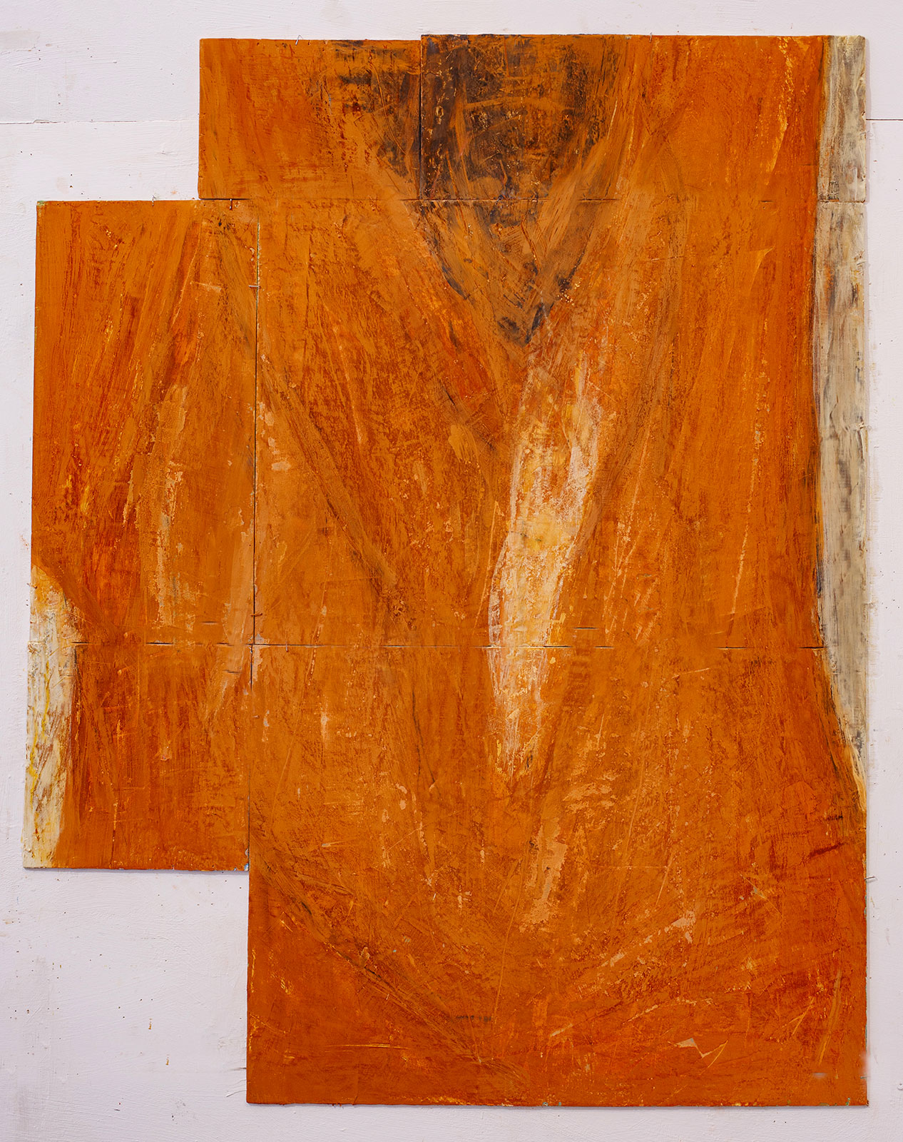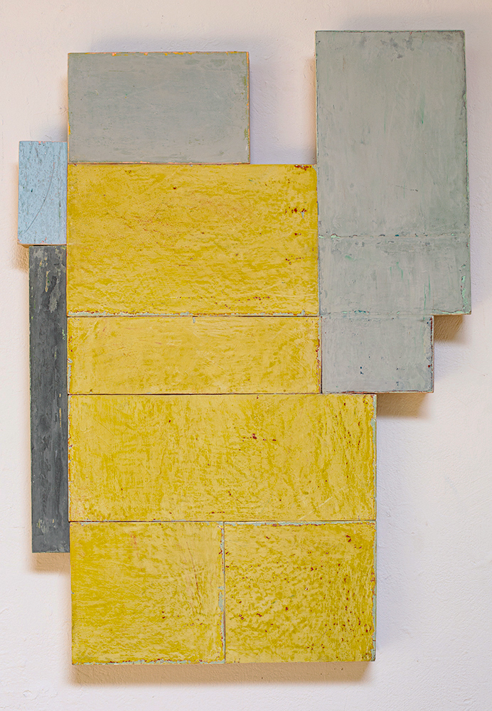 In applying the plaster to the wood, Fels works with two ancient Italian painting traditions. The fresco technique, historically applied to plaster wall surfaces, is cojoined in these pieces with traditional poplar panel painting. Thanks to its stability, poplar has been employed for Italian panel paintings for many centuries. Fashioning the pieces from sections of wood, the work refers to the modular form of altarpieces, albeit without iconography. Viewing the act of painting as meditation, Fels has spent years looking at altarpieces in Europe and Asia.